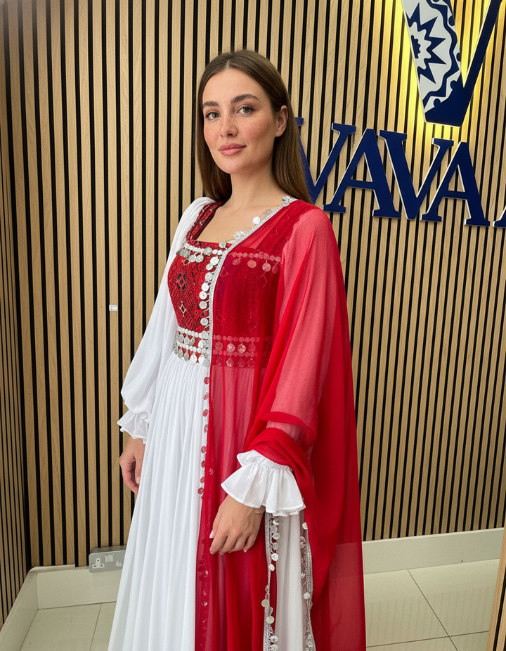 Afghan Kuchi Dress in Embroidered Red & White for Weddings, Gifts & More | Vavaa Clothing UK