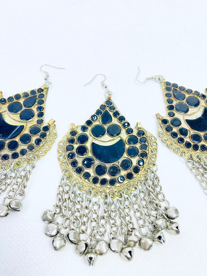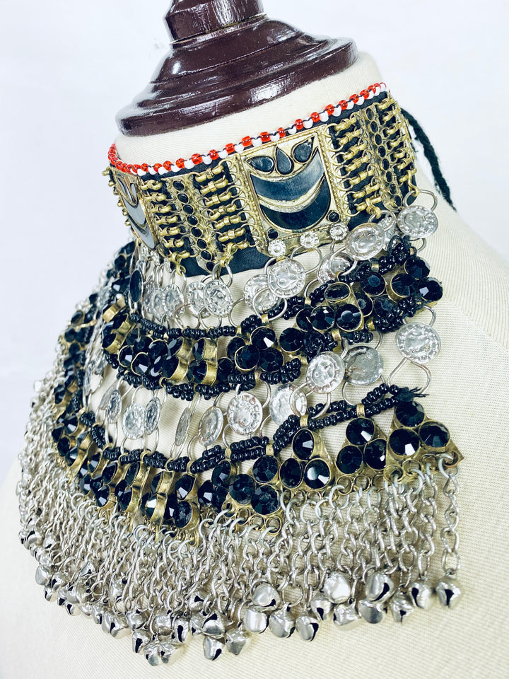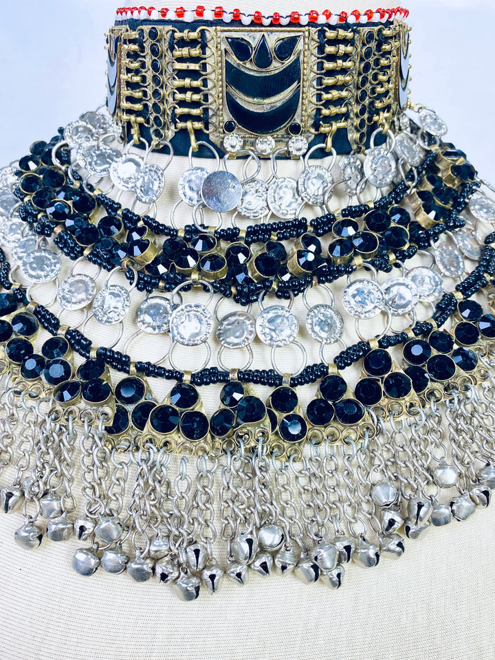 This vintage Afghan jewelry combines traditional craftsmanship with modern elegance. The striking contrast between the black gemstones and the silver base creates a bold yet sophisticated design, making it an ideal choice for various occasions. Whether you're looking for a statement necklace, earrings, or a bracelet, this jewelry set will add a unique and luxurious touch to any outfit.